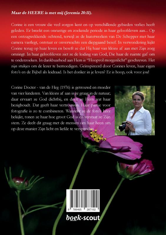Corine is een vrouw die veel zorgen kent en op verschillende gebieden verlies heeft geleden. Er breekt een onrustige en zoekende periode in haar geloofsleven aan… Op een ontzagwekkende ochtend, terwijl ze de kunstwerken van De Schepper met haar camera vastlegt, ontstaat er onverwachts een diepgaand besef. In verwondering kijkt Corine terug op haar leven en beseft ze dat Hij haar van kleins af aan met Zijn zorg omringt. In haar geloofsleven ziet ze de leiding van God, Die haar de ruimte gaf om te onderzoeken. In dankbaarheid aan Hem is “Hoopvol morgenlicht” geschreven. Het zijn stukjes om de lezer te bemoedigen. Geïnspireerd door Corines leven, haar eigen foto’s en de Bijbel als leidraad. Is het donker in je leven? Er is hoop, ook voor jou!