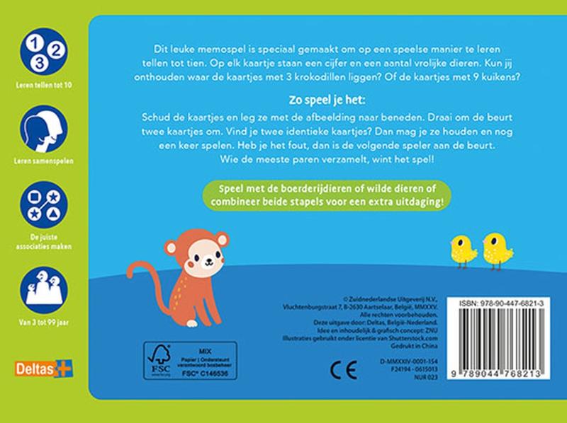 Wil je kind leren tellen? Dit leuke en educatieve memospel helpt om vertrouwd te raken met de cijfers en de hoeveelheden van 1 tot 10. Op elk kaartje staat een cijfer en de juiste hoeveelheid vrolijke dieren. Kan je kind onthouden waar de kaartjes met 3 krokodillen liggen? Of de kaartjes met 9 kuikens?