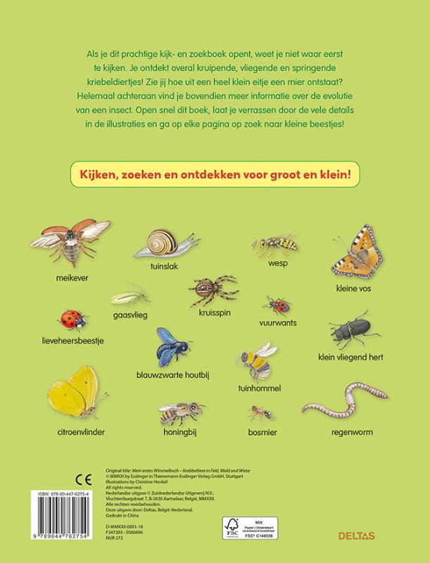 Kijken, zoeken en ontdekken voor groot en klein! Als je dit prachtige kijk- en zoekboek opent, weet je niet waar eerst te kijken. Je ontdekt overal kruipende, vliegende en springende kriebeldiertjes! Helemaal achteraan vind je bovendien meer informatie over de evolutie van een insect. Open snel dit boek, laat je verrassen door de vele details in de illustraties en ga op elke pagina op zoek naar kleine beestjes! Een stevig kartonboek op groot formaat met kleurrijke illustraties.