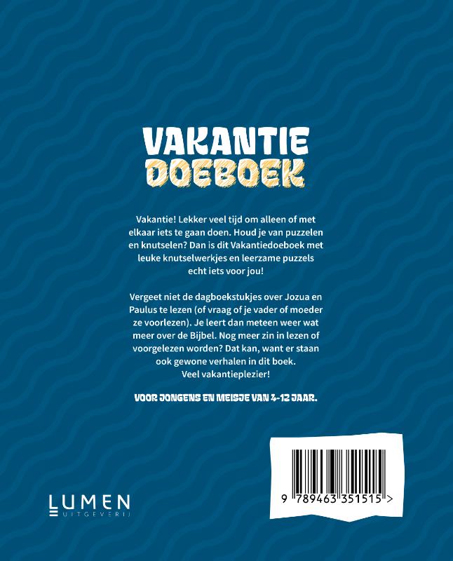 Vakantie! Lekker veel tijd om te lezen, te puzzelen en te knutselen.Met dit boek kan dat allemaal.De dagboekstukjes over Jozua en Paulus van ds. R. van de Beek en ds. M.T. Al-Chalabi spreken jou vast aan. Door de puzzels blijven de Bijbelgedeelten nog beter bij je hangen. En in de knutselwerkjes heb je al zin voor je eraan begint. Ook kun je genieten van twee gewone verhalen.Voor jongens en meisje van 4-12 jaar.