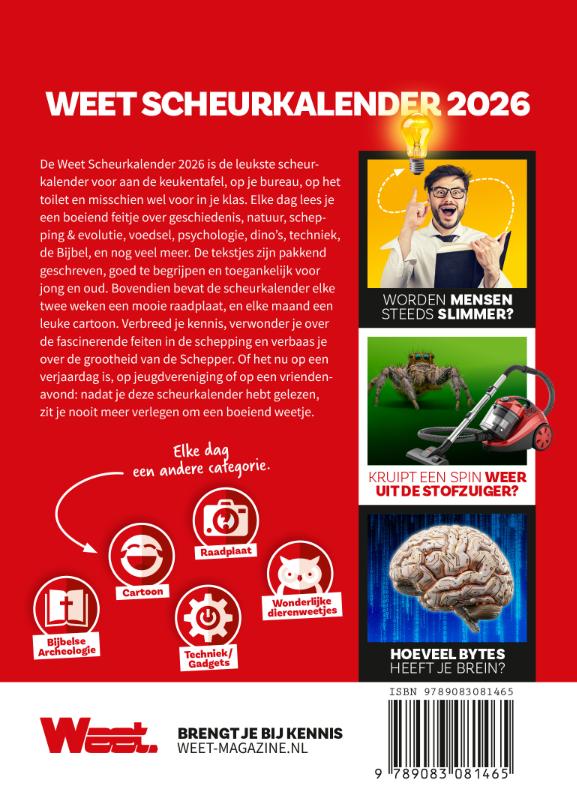 De Weet Scheurkalender 2026 is de leukste scheurkalender voor aan de keukentafel, op je bureau, op het toilet en misschien wel voor in je klas. Elke dag lees je een boeiend feitje over geschiedenis, natuur, schepping & evolutie, voedsel, psychologie, dino’s, techniek, de Bijbel, en nog veel meer. De tekstjes zijn pakkend geschreven, goed te begrijpen en toegankelijk voor jong en oud. Bovendien bevat de scheurkalender elke twee weken een mooie raadplaat, en elke maand een leuke cartoon. Verbreed je kennis, verwonder je over de fascinerende feiten in de schepping en verbaas je over de grootheid van de Schepper. Of het nu op een verjaardag is, op jeugdvereniging of op een vriendenavond: nadat je deze scheurkalender hebt gelezen, zit je nooit meer verlegen om een boeiend weetje.